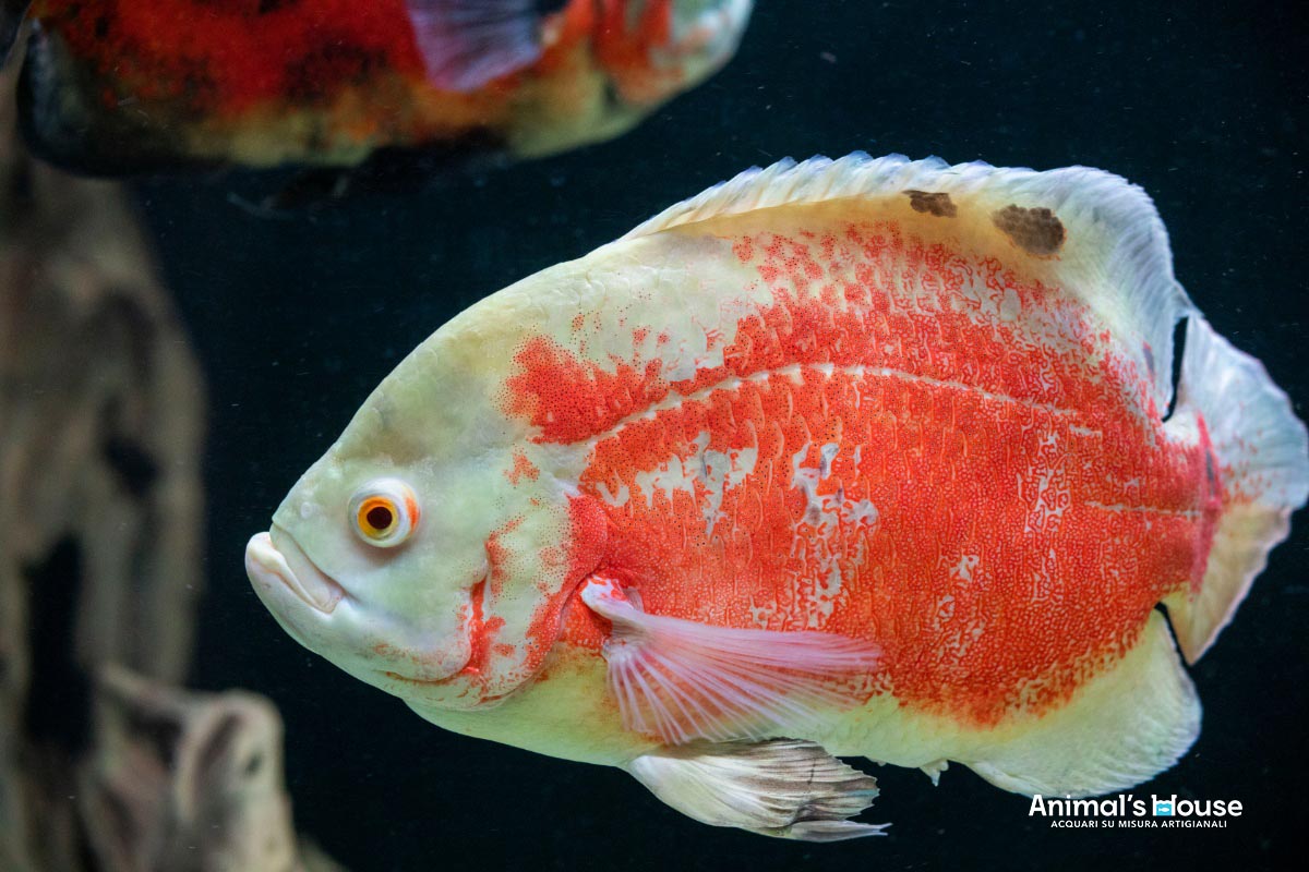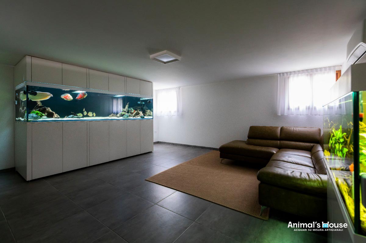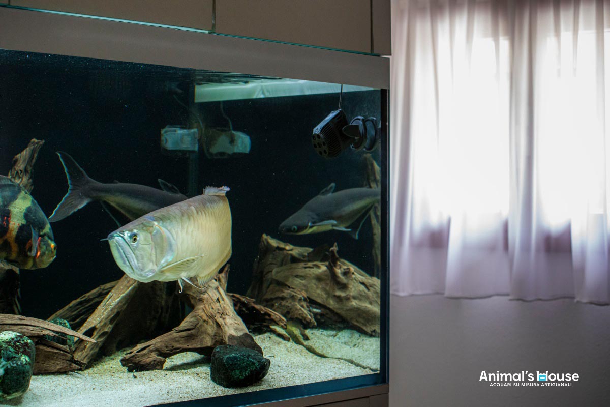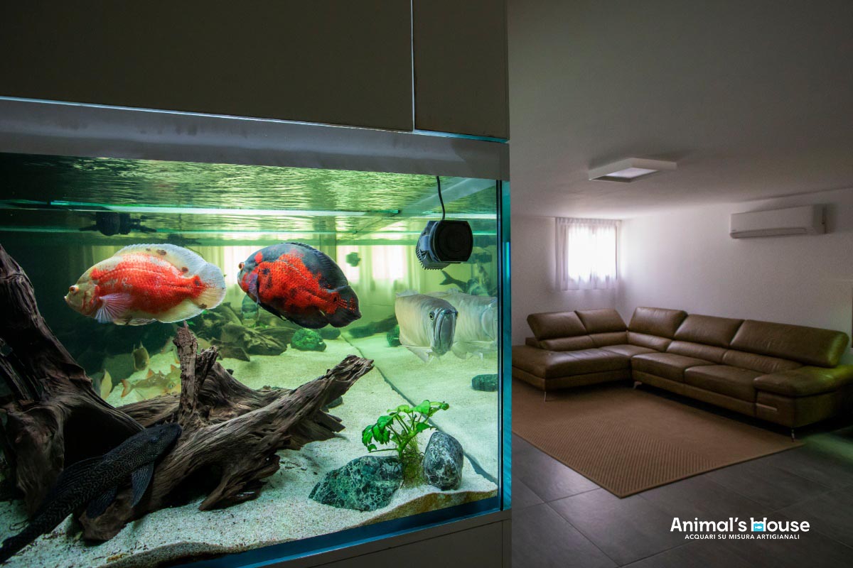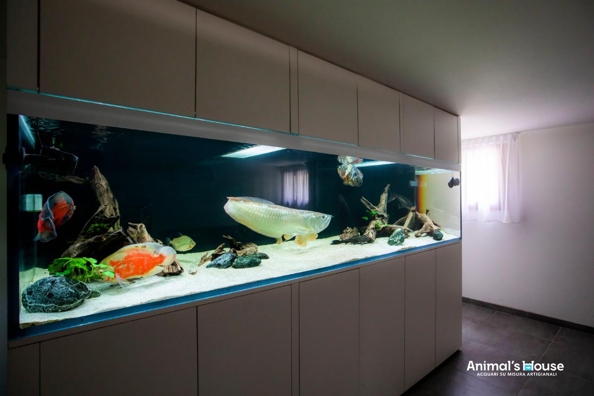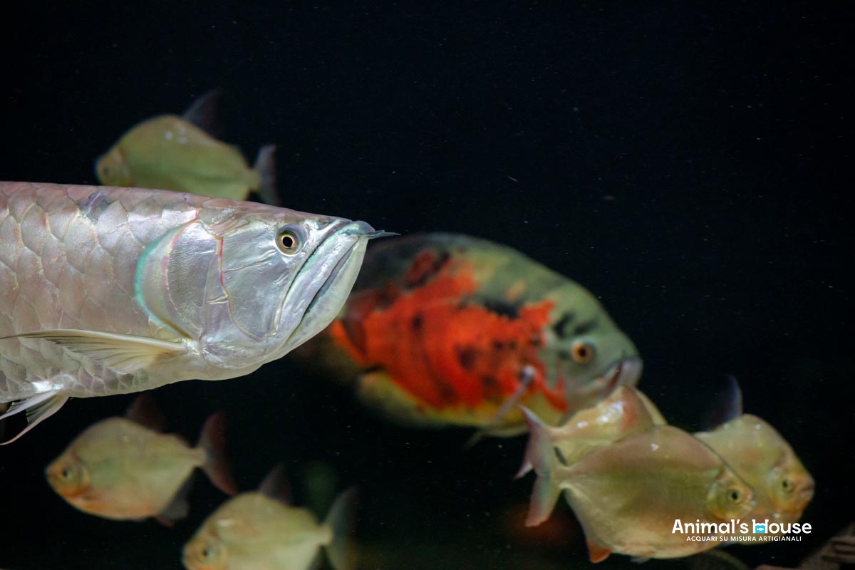 Questo acquario è stato studiato per favorire l’allevamento di grossi pesci come l’Arowana (Osteoglossum Bicirrhosum) e l’Oscar (Astronotus Ocellatus), insieme a varie altre specie compatibili, che formano un contorno in continuo movimento.