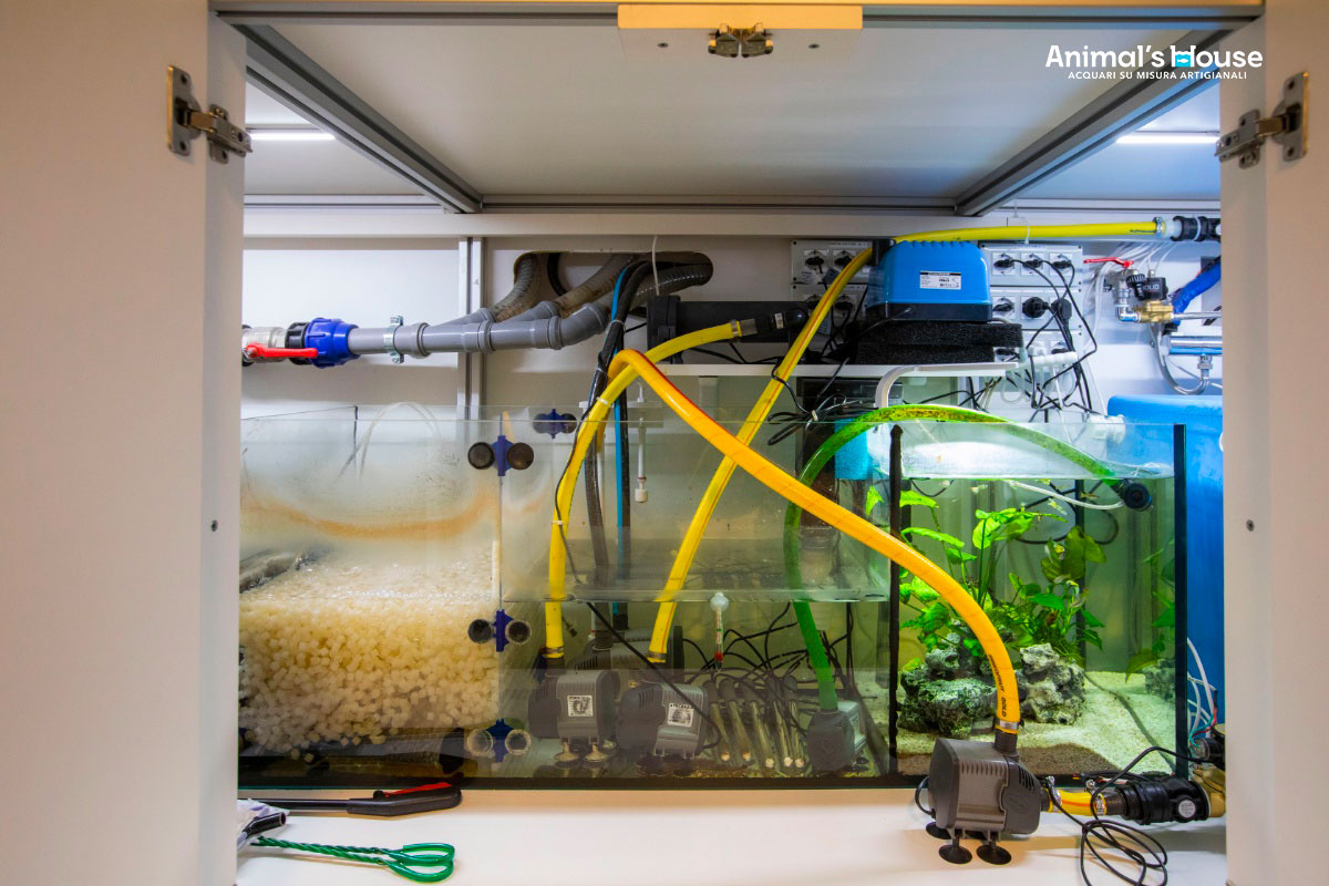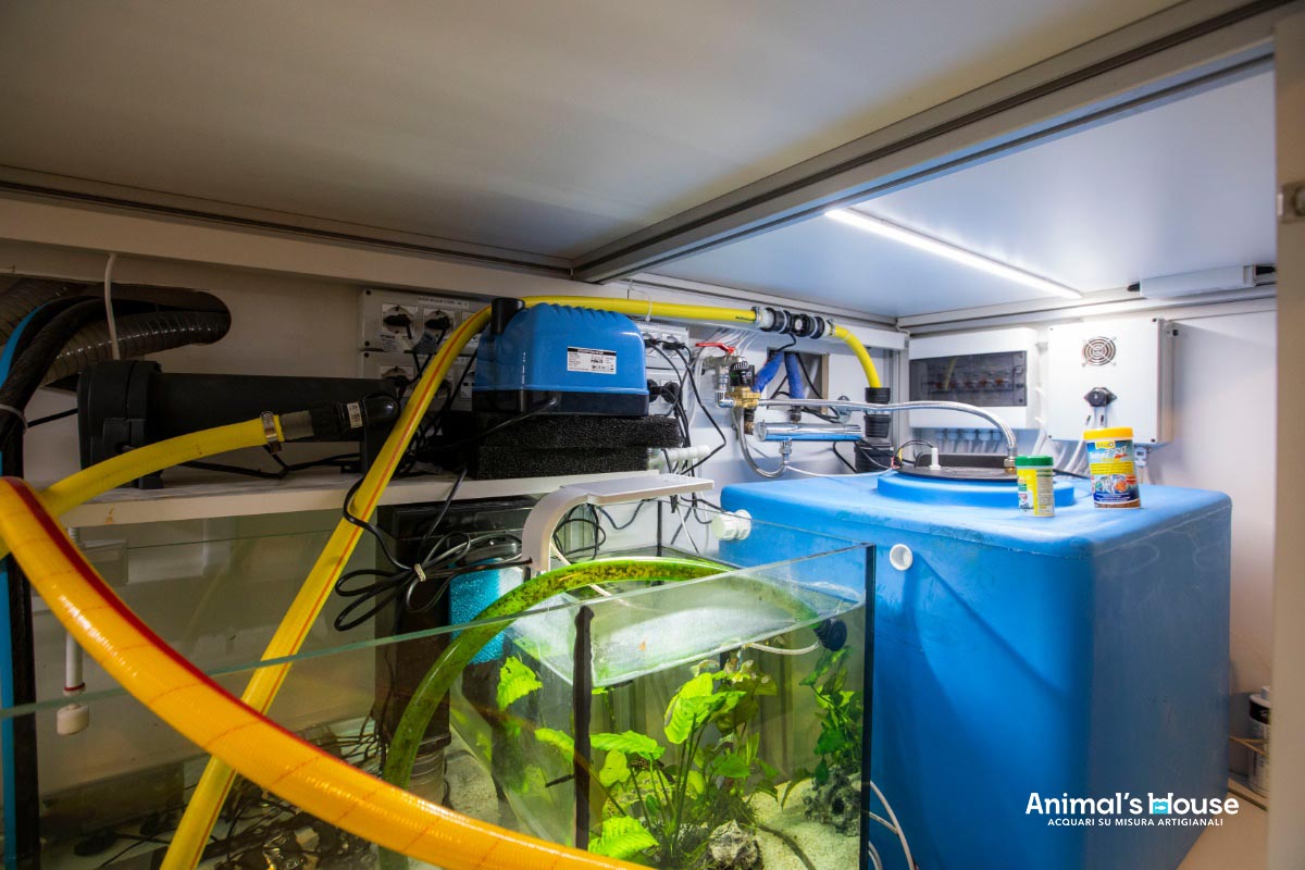 La scelta è stata dettata da ragioni tanto estetiche quanto tecniche: in questo modo, infatti, oltre a garantire una maggiore pulizia estetica, si consente agli inquilini dell’acquario di godere di grande spazio per il nuoto libero.