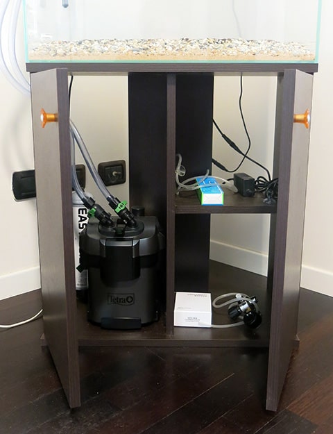 In un acquario appena installato spesso si forma un piccolo vortice all’estremità superiore del deflusso se le prestazioni del filtro sono sufficienti. Capita spesso che spesso che questo vortice sia permanente e che sia utile per rimuovere la schiuma superficiale sul pelo dell’acqua. Ma con un’adeguata colonizzazione batterica della superficie, il vortice di solito scompare dopo pochi giorni. Nell’immagine il filtro Tetra EX 400 Plus del nostro 60 litri collegato alla Lily Pipe.